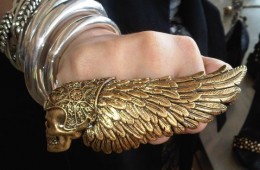 This Alexander McQueen ring is called the "Hell's Knuckle" duster ring and is made of gold brass. It's from the last McQueen collection designed prior to the designer's untimely death.This piece features McQueen's signature skull design combined with a wing motif. Underneath there are 3 rings in which your fingers slide easily into.